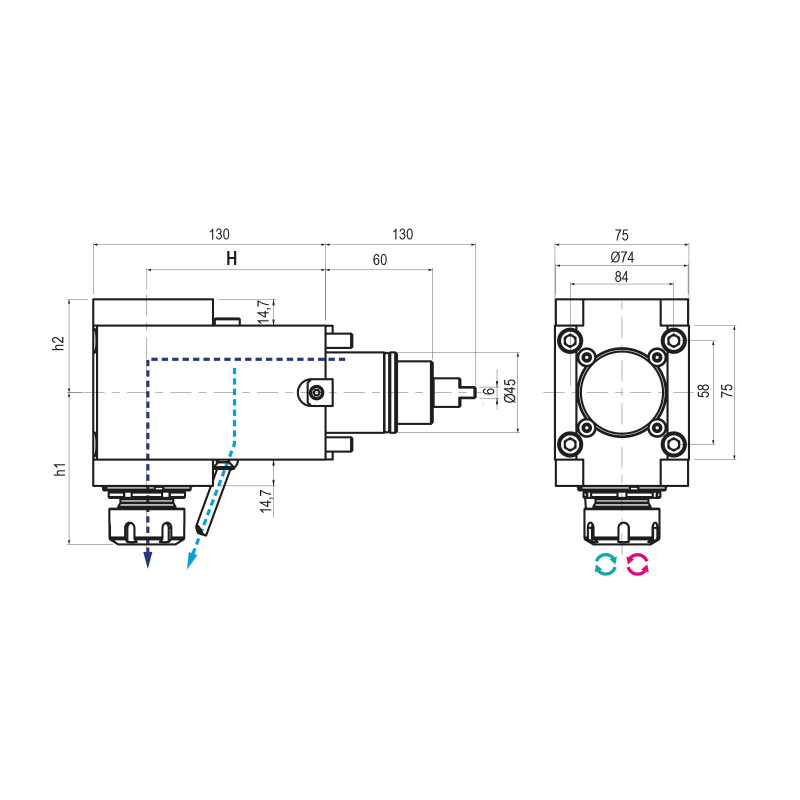 Інструмент BMT45 з прямим кутовим приводом, внутрішній потік охолоджувальної рідини ER25 (80 бар), співвідношення 1:1, H100 (Gerardi)