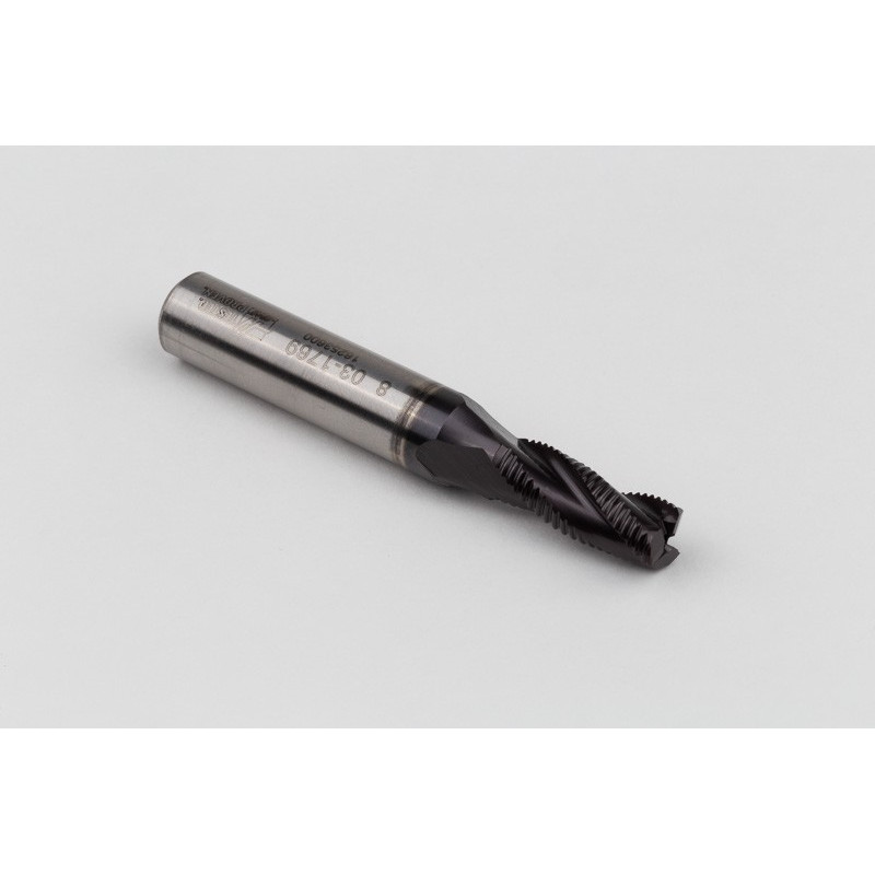 8mm Dia. Cobalt Fine Roughing End Mill, 3 Flute, TiAIN Coated, 10mm Weldon Shank x 20mm LOC, 0.5mm Chamfer, FPR