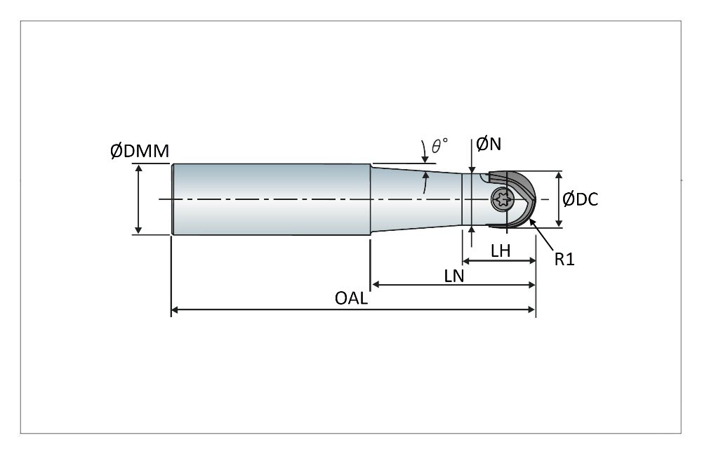 8mm Diameter Indexable Ball End Mill, 12mm Tapered Steel Shank x 110mm Overall Length x 25mm Head Length, 1 Insert