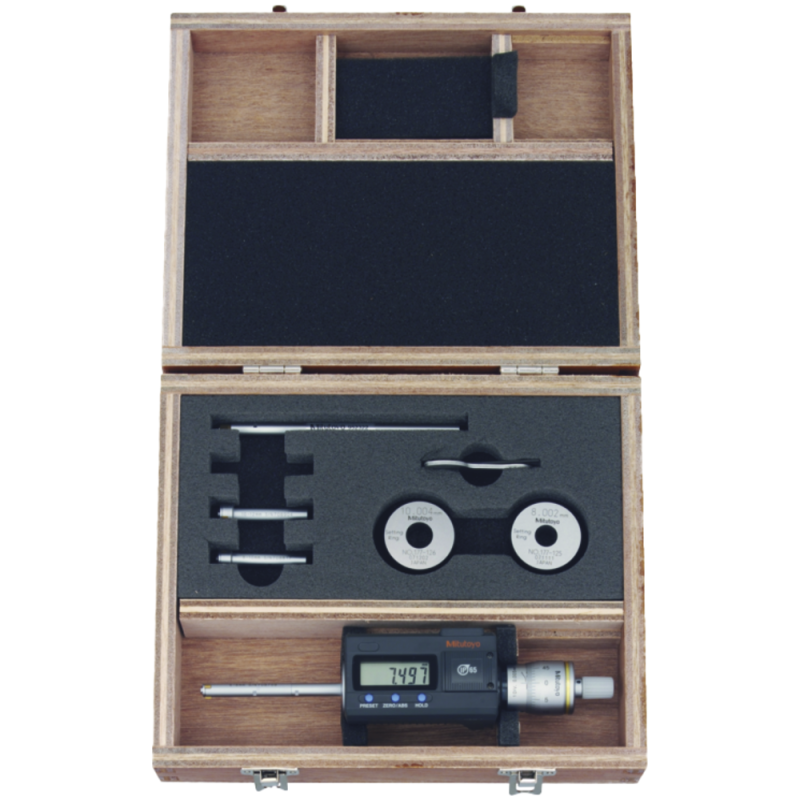 Contents:1 micrometer, 3 measuring heads 6-8 / 8-10 / 10-12 mm, 2 adjusting rings Ø 8 / 1