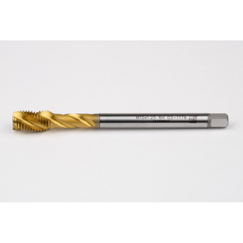 M10x1.25 MF HSS-E Spiral Flute Tap, 7mm Shank x 16mm Thread Length, 2.5XD, Mod. Bottoming, 3 Flute, 6H, TiN Coated