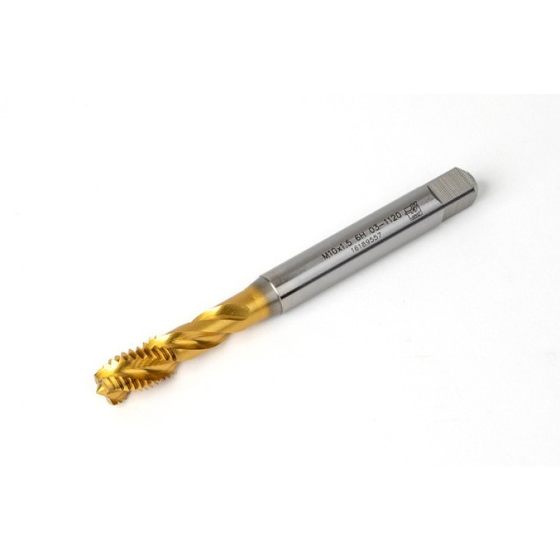M10x1.5 M HSS-E Spiral Flute Tap, 10mm Shank x 15mm Thread Length, 2.5XD, Mod. Bottoming, 3 Flute, 6H, TiN Coated