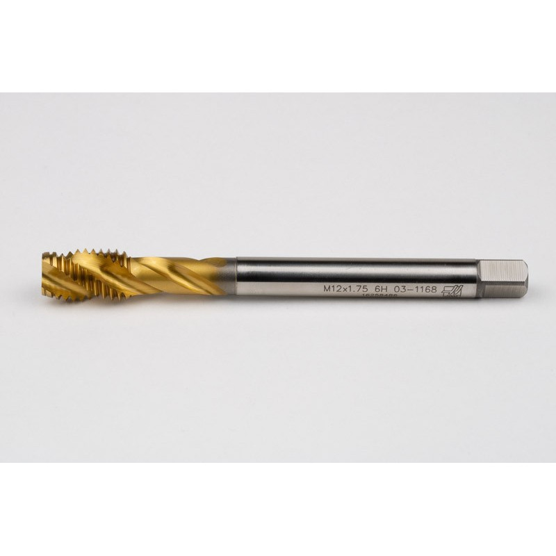 M12x1.75 M HSS-E Spiral Flute Tap, 9mm Shank x 18mm Thread Length, 2.5XD, Mod. Bottoming, 3 Flute, 6H, TiN Coated