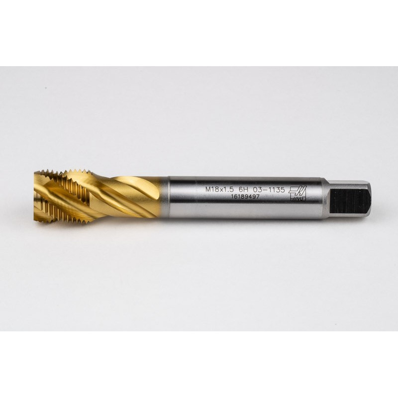 M18x1.5 MF HSS-E Spiral Flute Tap, 14mm Shank x 17mm Thread Length, 2.5XD, Mod. Bottoming, 4 Flute, 6H, TiN Coated