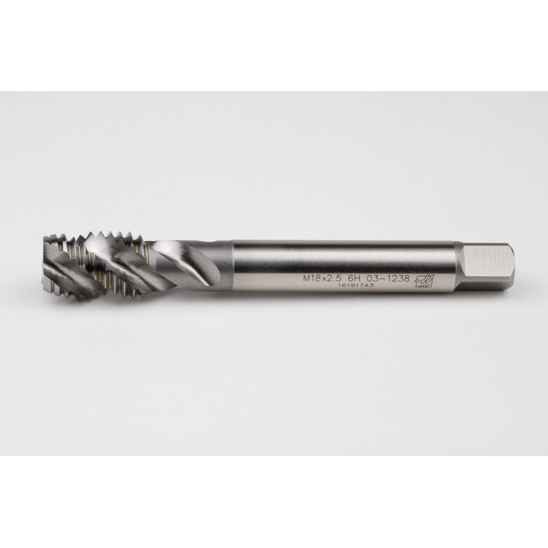 M18x2.5 M HSS-E Spiral Flute Tap, 14mm Shank x 25mm Thread Length, 2.5XD, Mod. Bottoming, 3 Flute, 6H, Uncoated