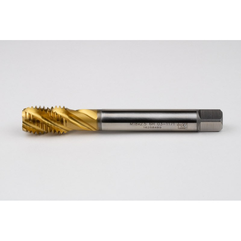 M18x2.5 M HSS-E Spiral Flute Tap, 14mm Shank x 25mm Thread Length, 2.5XD, Mod. Bottoming, 4 Flute, 6H, TiN Coated