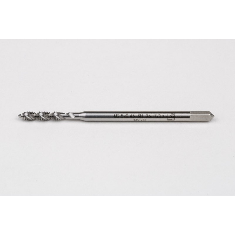 M2.5x0.45 M HSS-E Spiral Flute Tap, 2.8mm Shank x 9mm Thread Length, 2.5XD, Mod. Bottoming, 2 Flute, 6H, Uncoated