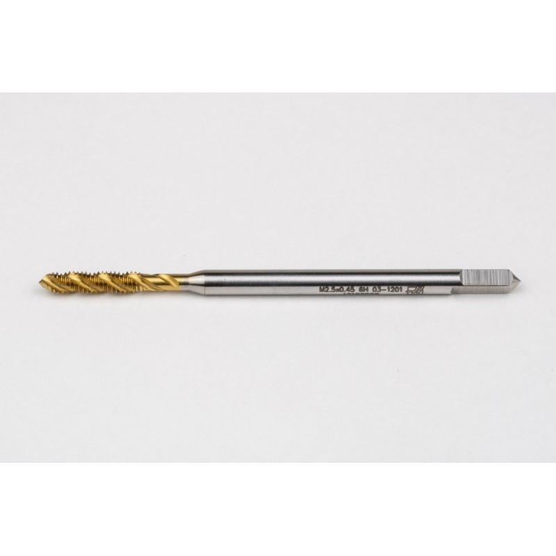 M2.5x0.45 M HSS-E Spiral Flute Tap, 2.8mm Shank x 9mm Thread Length, 2.5XD, Mod. Bottoming, 3 Flute, 6H, TiN Coated