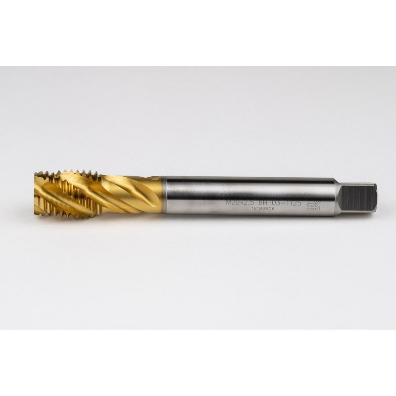 M20x2.5 M HSS-E Spiral Flute Tap, 16mm Shank x 25mm Thread Length, 2.5XD, Mod. Bottoming, 4 Flute, 6H, TiN Coated