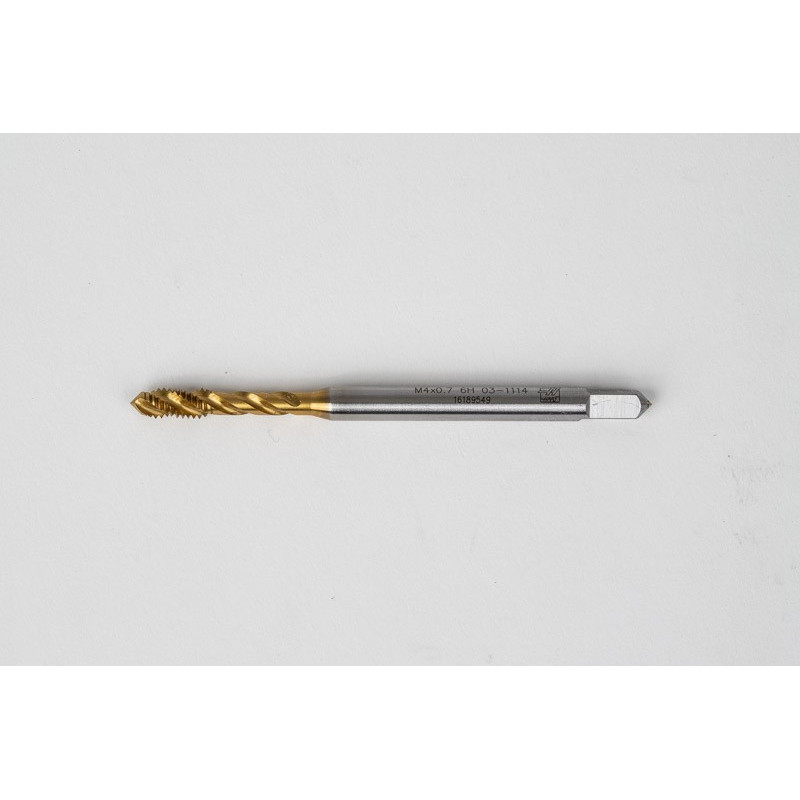 M4x0.7 M HSS-E Spiral Flute Tap, 4.5mm Shank x 7mm Thread Length, 2.5XD, Mod. Bottoming, 3 Flute, 6H, TiN Coated