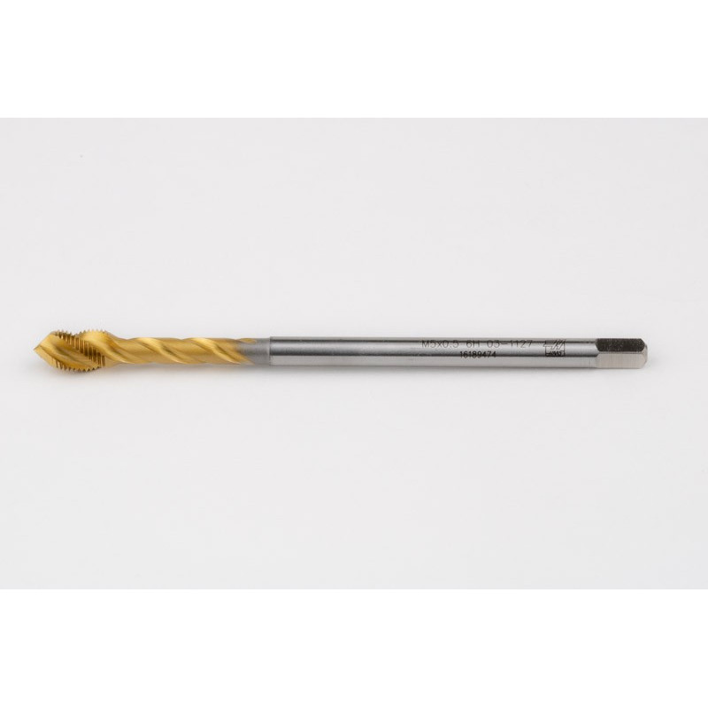 M5x0.5 MF HSS-E Spiral Flute Tap, 3.5mm Shank x 5mm Thread Length, 2.5XD, Mod. Bottoming, 3 Flute, 6H, TiN Coated