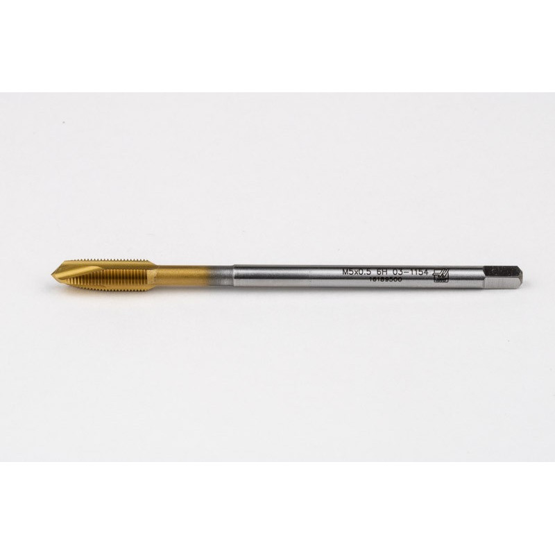 M5x0.5 MF HSS-E Spiral Point Tap, 3.5mm Shank x 11mm Thread Length, 3XD, Plug, 3 Flute, 6H, TiN Coated