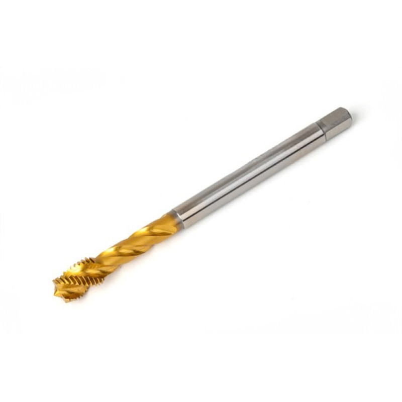 M8x1.0 MF HSS-E Spiral Flute Tap, 6mm Shank x 10mm Thread Length, 2.5XD, Mod. Bottoming, 3 Flute, 6H, TiN Coated
