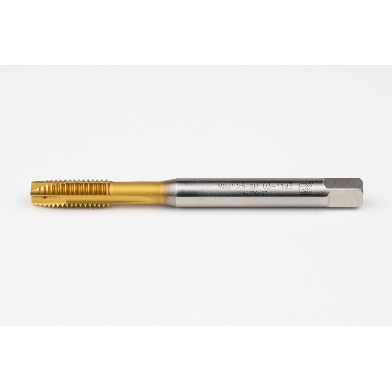 M8x1.25 M HSS-E Spiral Point Tap, 8mm Shank x 20mm Thread Length, 3XD, Plug, 3 Flute, 6H, TiN Coated